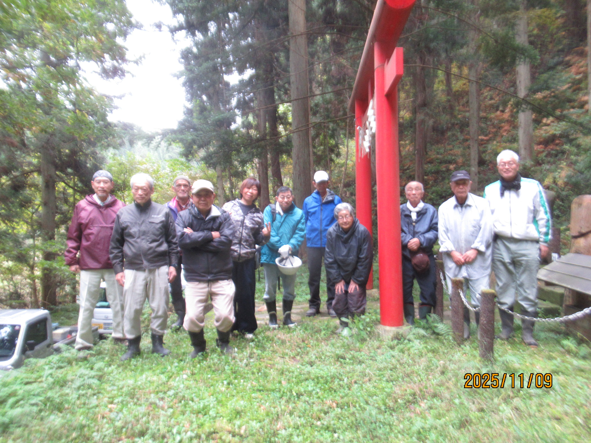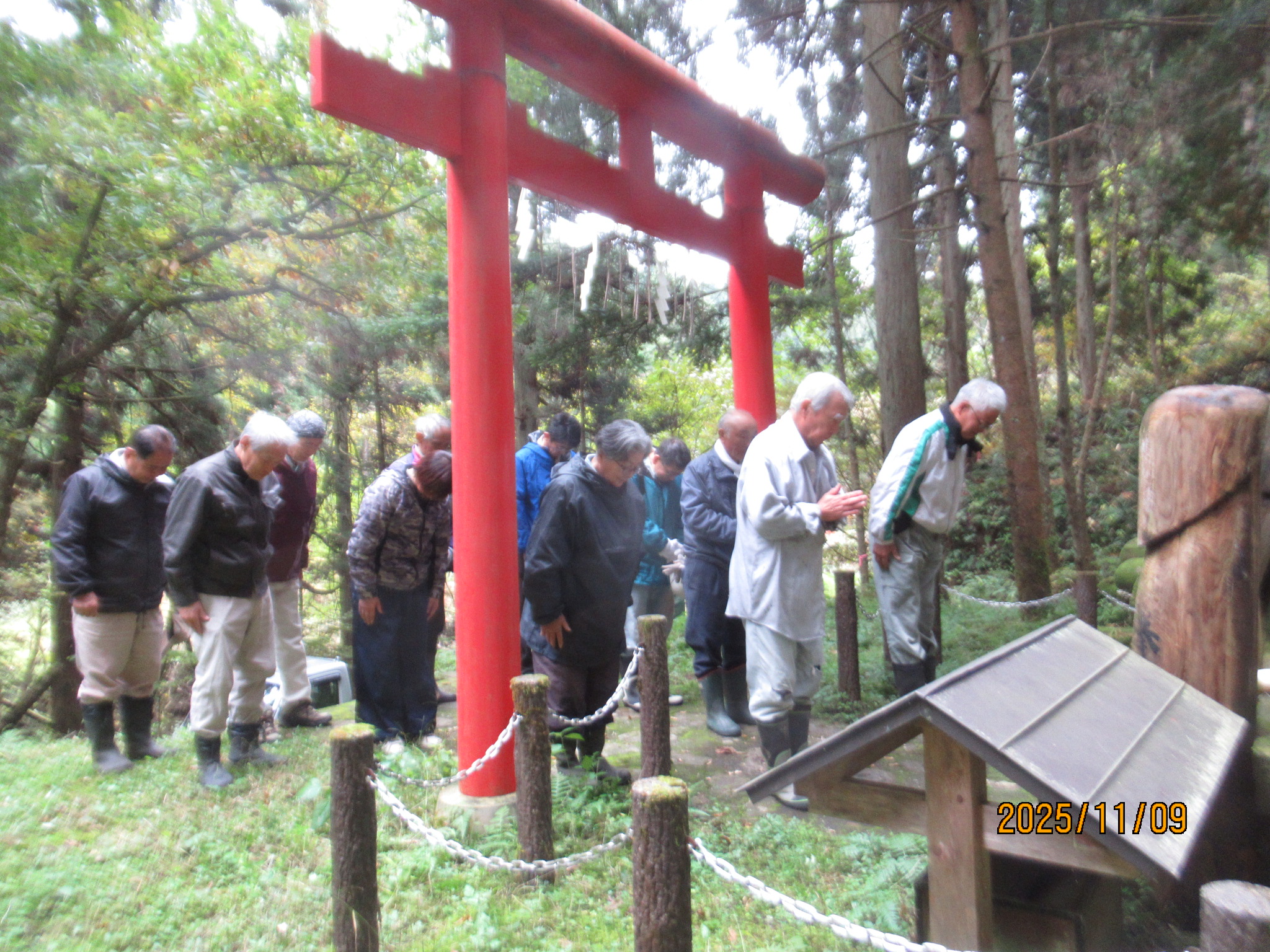 例年のとおり作業前に、月岡の山の神さまに、今年一年、事故やケガがなかったことへのお礼の参拝を。