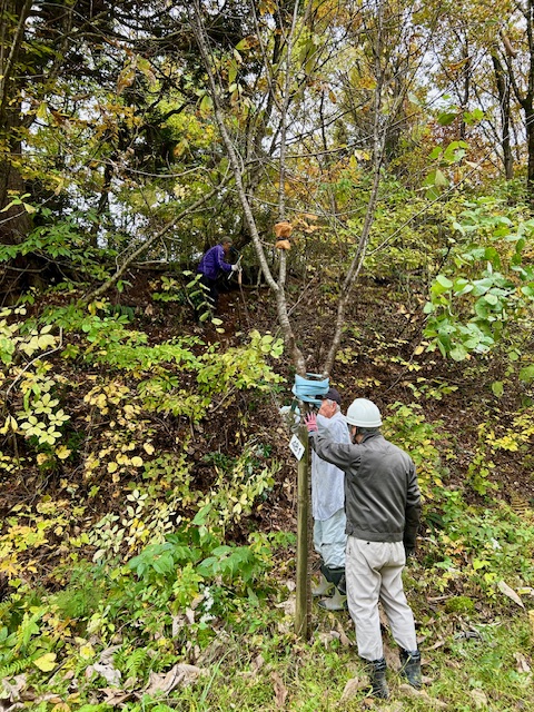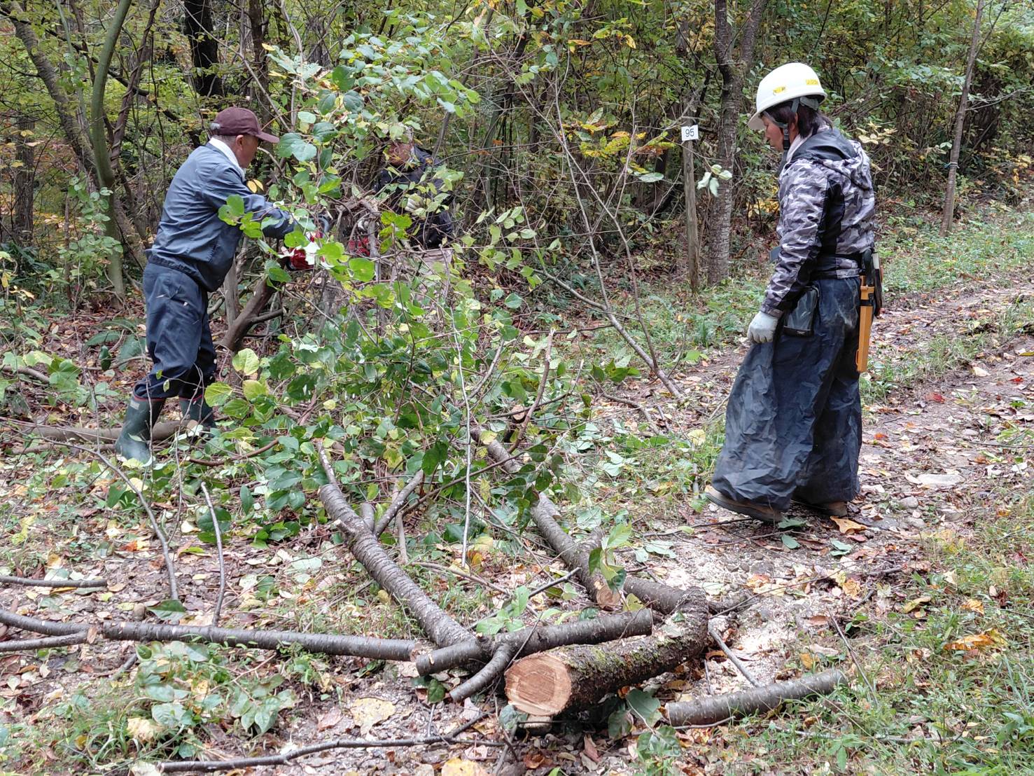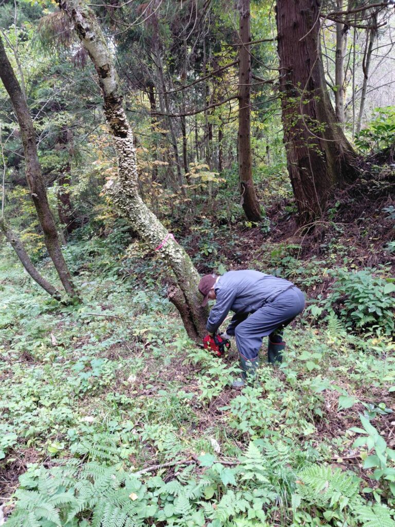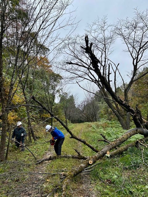 今回は、立ち枯れて放っておくと危険になる枯木の伐採や、林道をふさいでいる倒木の処理、通行の支障になっているオオヤマザクラの木起し、また、放置しておけないほど太くなった葛の切断などを行いました。