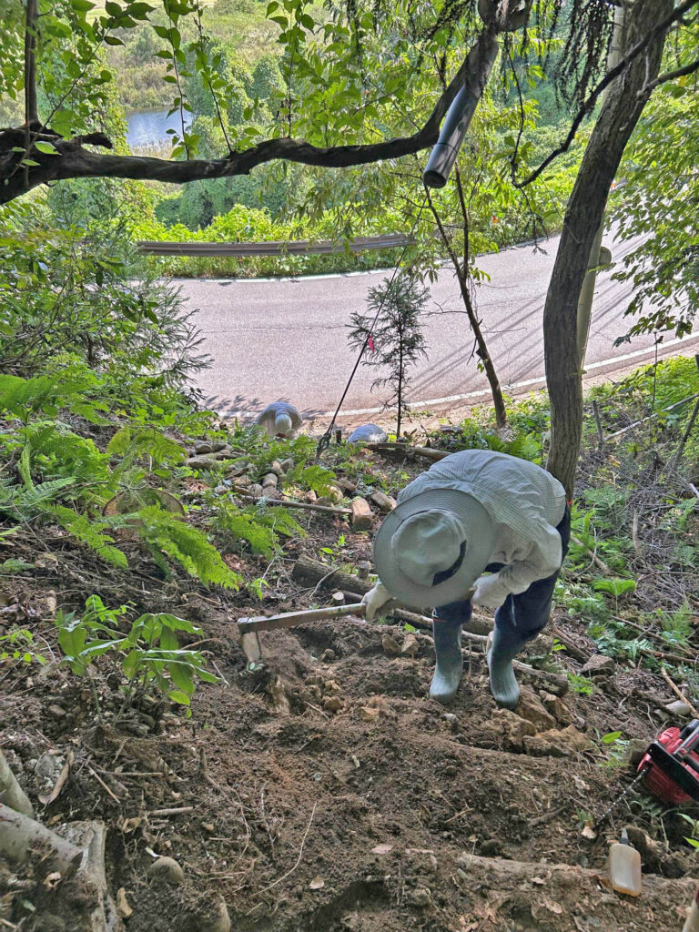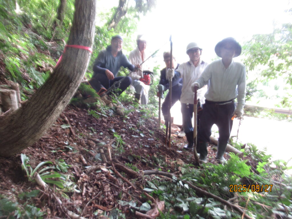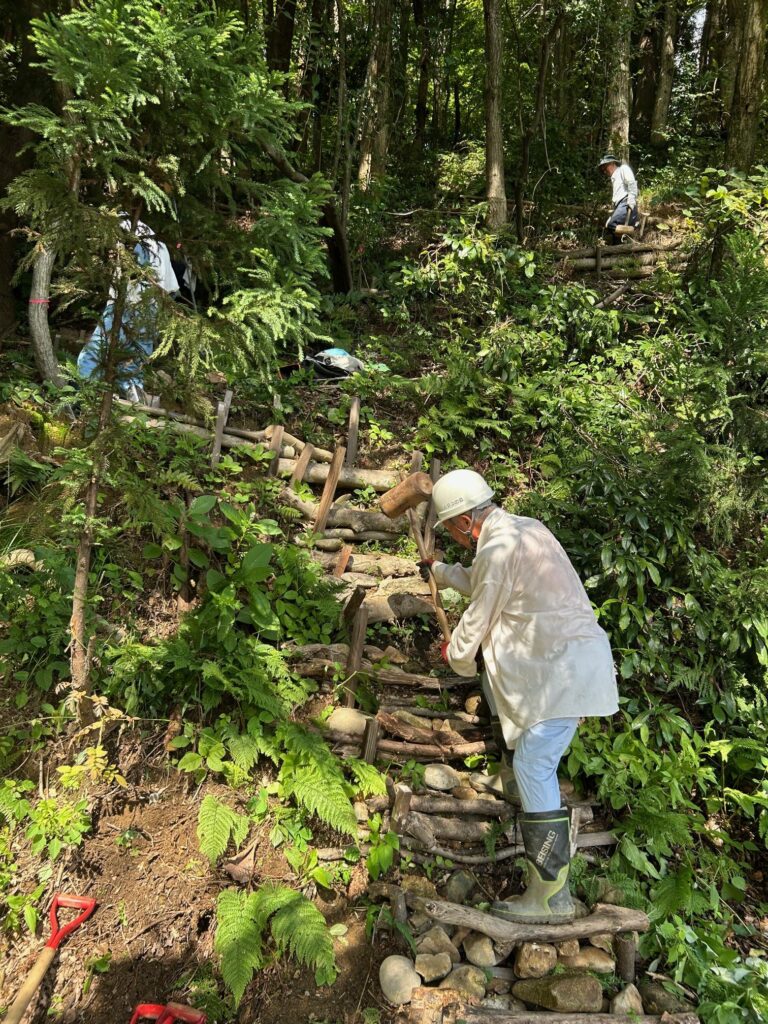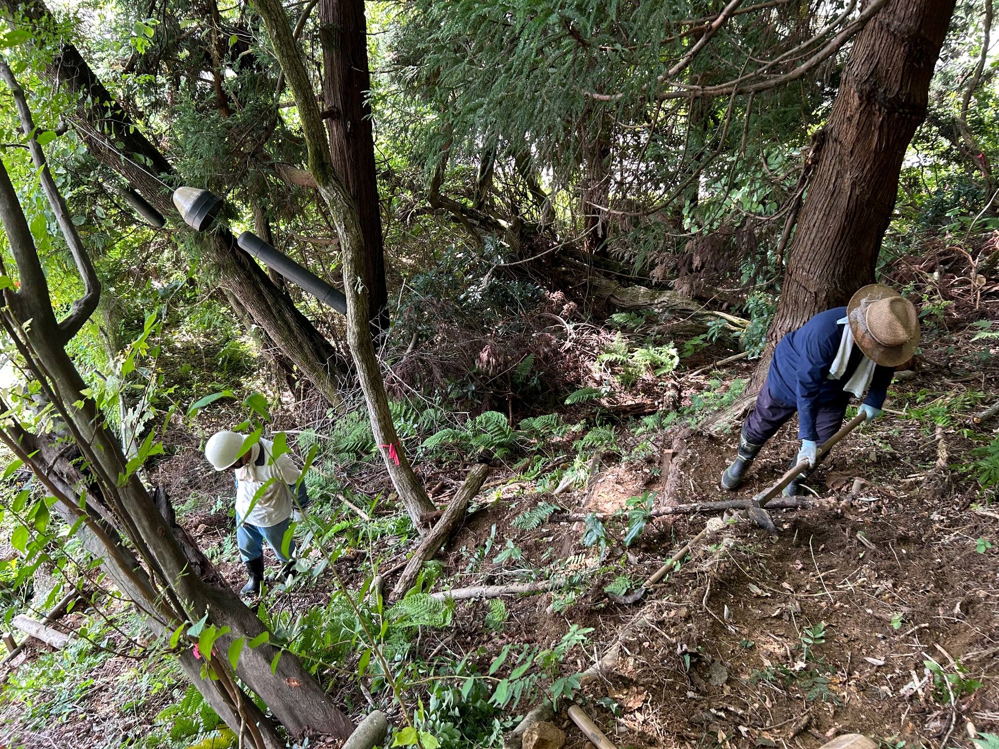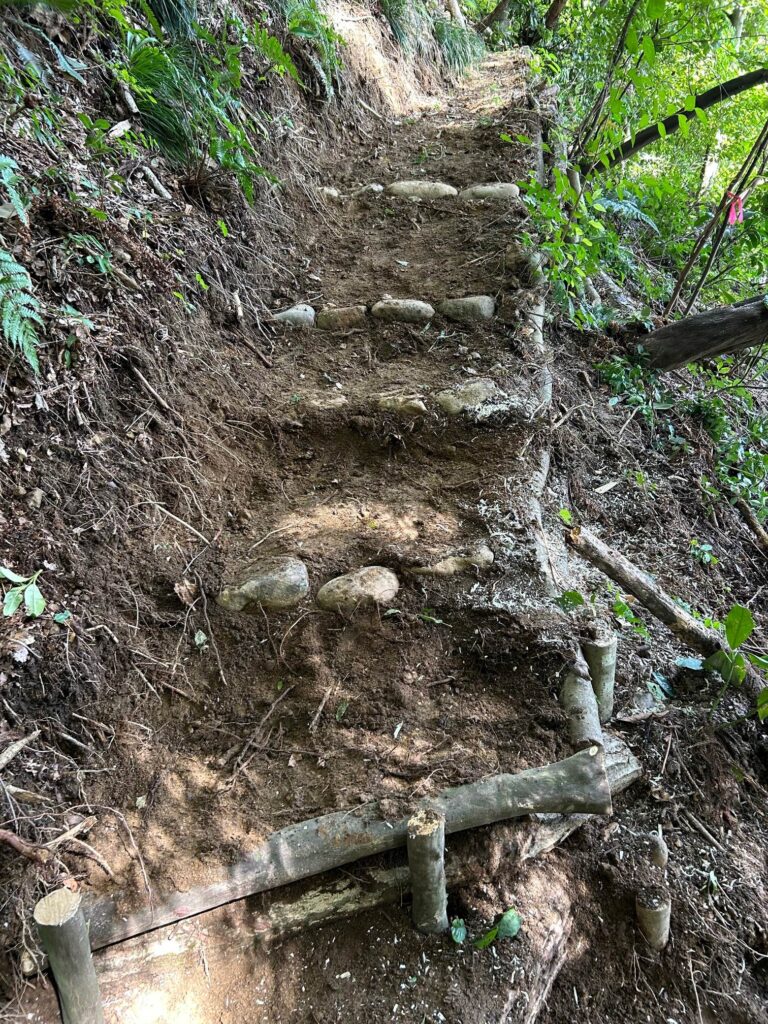 前回作業の7月(8月は暑さのため休止)、月岡側の開通には至りませんでしたが、今回、大まかには通れるようになり、これまで造った山道を、歩きやすいように階段を増やしたり石を敷き詰めたりの作業でした。